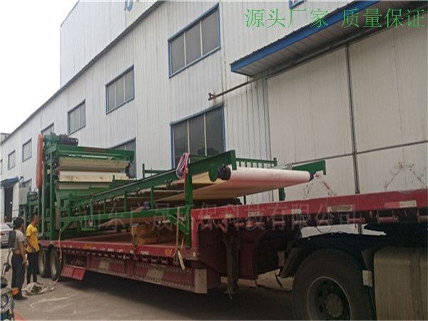 带式压滤脱水机工作时,减速电机带动传动滚筒,通过摩擦力驱动输送带运行,物料由进料装置进入并随输送带一起运动,经过一定的距离到达出料口转入下一道工艺环节。
