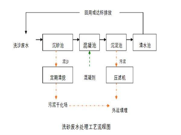 洗沙场污水处理器,洗沙污水经排污沟进入平流沉砂池进行预处理,去除废水中的大颗粒泥沙等,出水泵入混凝池,此时投加混凝剂,将废水中的杂质聚集在一起并产生“矾花”,出水进入沉淀池, 池底污泥通过重力管道定期排泥,沉淀池出水进入清水池,通过循环水泵回用。